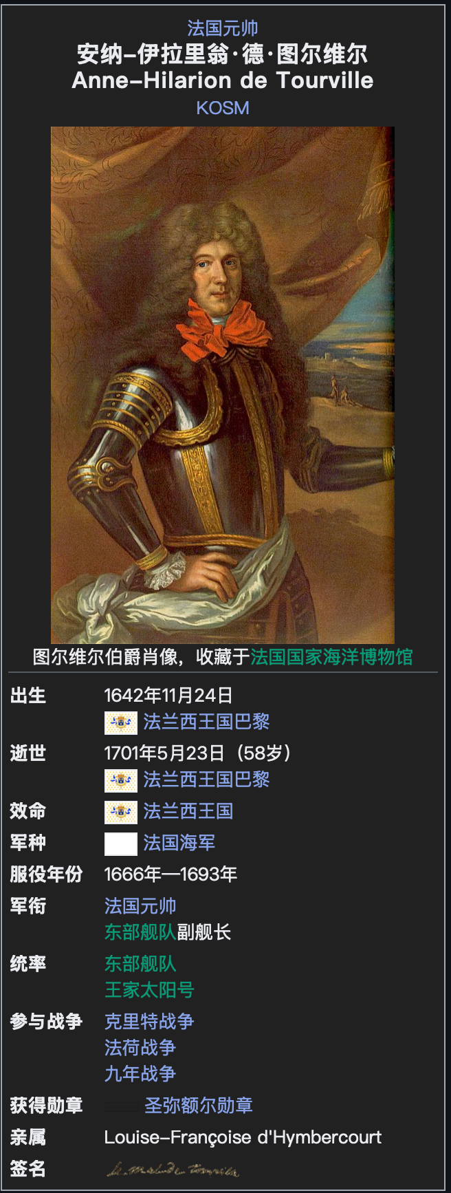 图尔维尔 - 维基百科,自由的百科全书 安纳-伊拉里翁·德·科斯唐坦,图尔维尔伯爵(法语:Anne-Hilarion de Costentin, Comte de Tourville,法语发音:an ilaʁjɔ̃ də kɔstɑ̃tɛ̃ kɔ̃t də tuʁvil;1642年11月24日—1701年5月23日),法国贵族、海军上将与法国英雄。