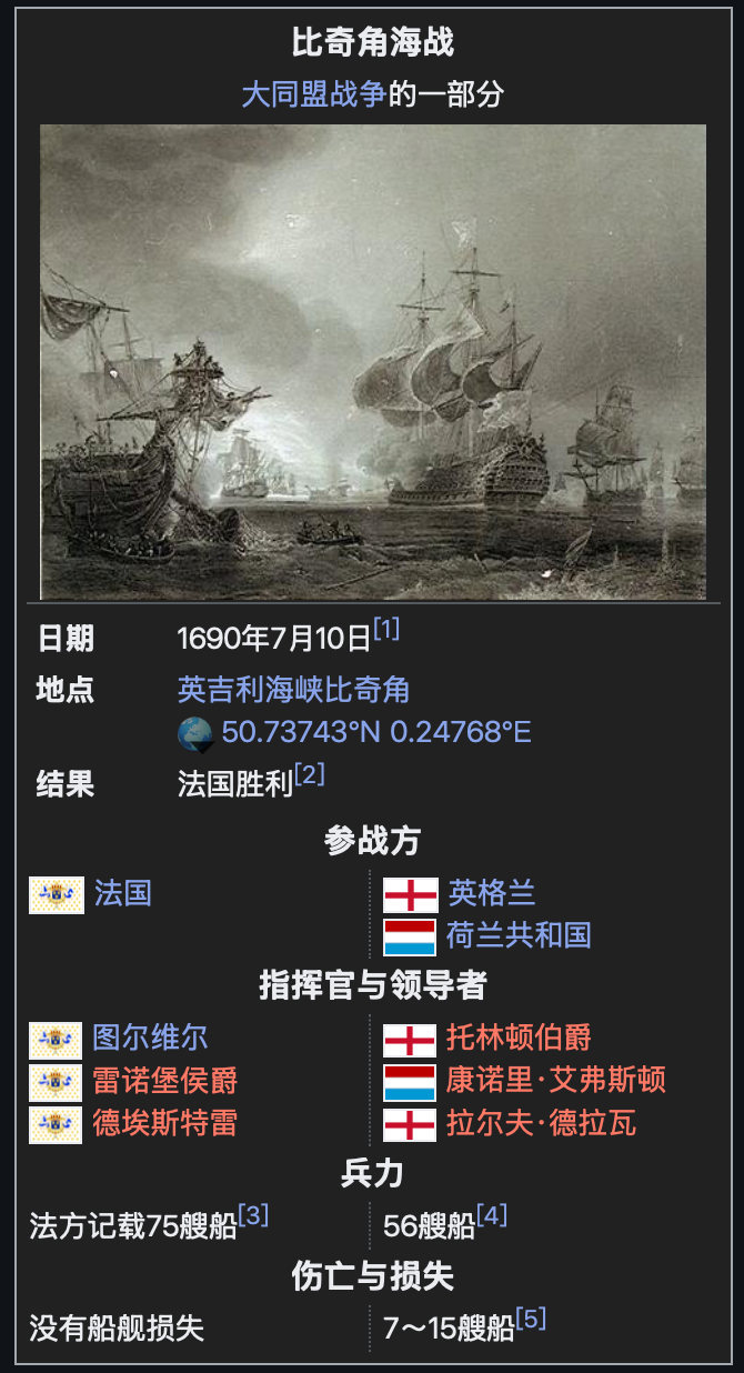 比奇角海战 - 维基百科,自由的百科全书 比奇角海战(英语:Battle of Beachy Head,又称Battle of Bévéziers,法语:Bataille du cap Béveziers)发生于1690年7月10日,是大同盟战争中的一场海战。此战役法国海军击败了英荷联合舰队,取得重大的战术胜利。2荷兰海军损失将近六艘战列舰和一些船只,英国也损失一艘,而法国没有船损失。战后英吉利海峡的制海权暂时落入法国手中,但法国海军将领图尔维尔未能趁胜追击,导致联军舰队得以逃回泰晤士河。 图尔维尔因为追击不力而饱受批评,之后被解除指挥权;英国海军上将托林顿伯爵则因为败战而受到军事法庭审判,虽然最后无罪释放,但国王威廉三世解除了他的职位。